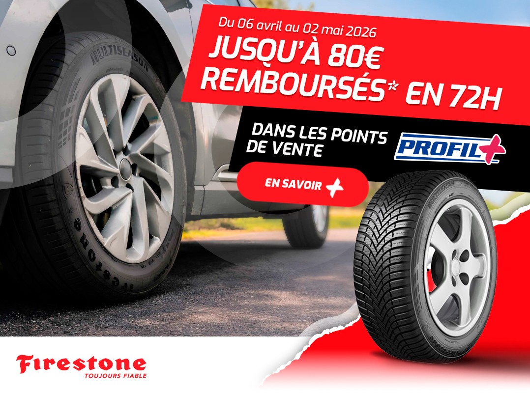 Du 06 avril au 02 mai 2026, bénéficiez de remboursements exceptionnels pour l’achat de pneus Firestone été, hiver ou toutes saisons, achetés, montés et équilibrés dans les centres Profil Plus participants. Offre valable à partir du 16 pouces, sur les gammes Tourisme, 4x4 et Camionnette.